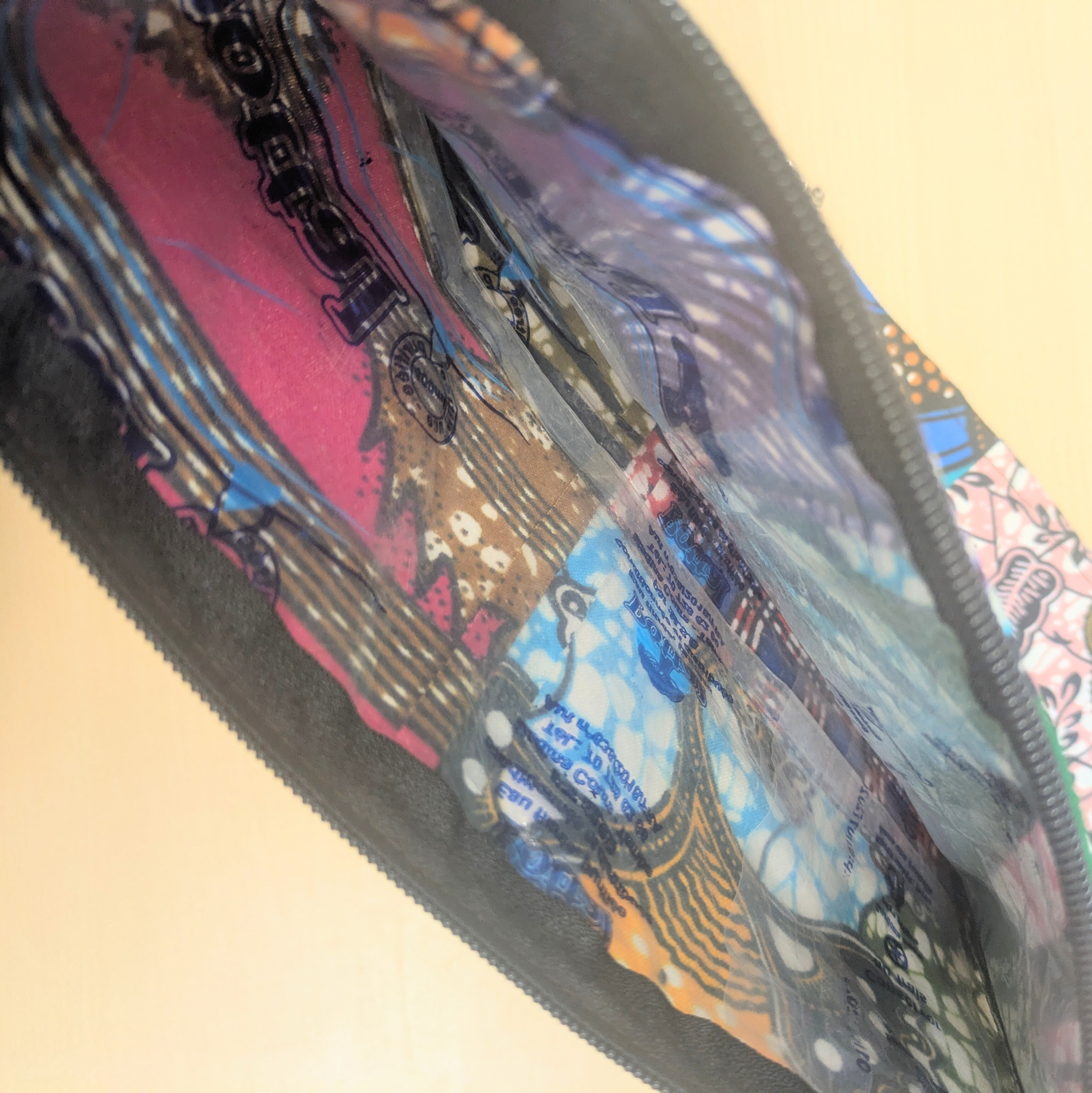 ポーチの内側にはセネガルで飲料水がパウチされていたビニール素材を使っています。