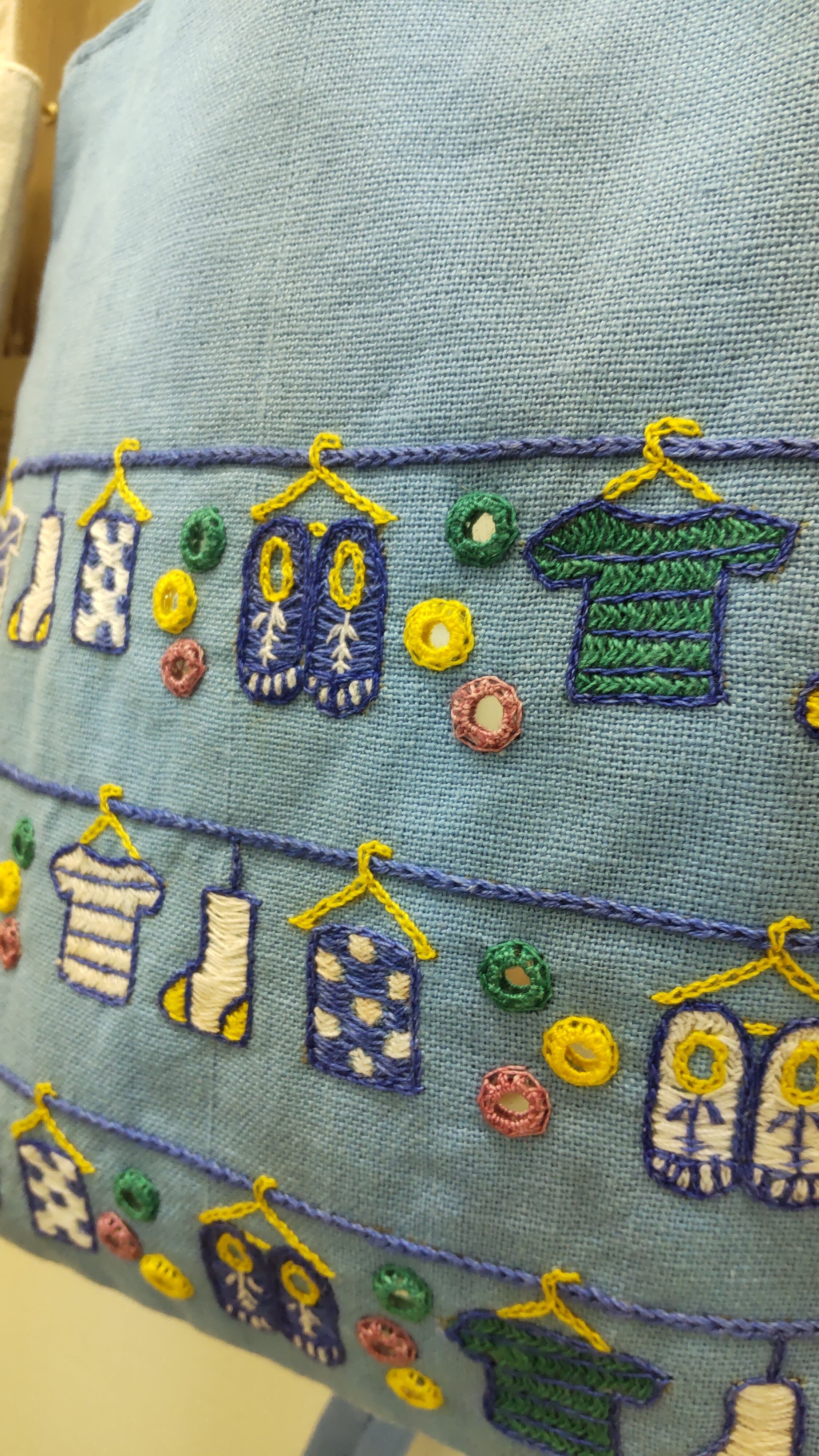 1つ1つ鏡を丁寧に縫いこんでいくミラー刺繍は、砂漠が広がるインド西北部グジャラート州の伝統的な刺繍です。